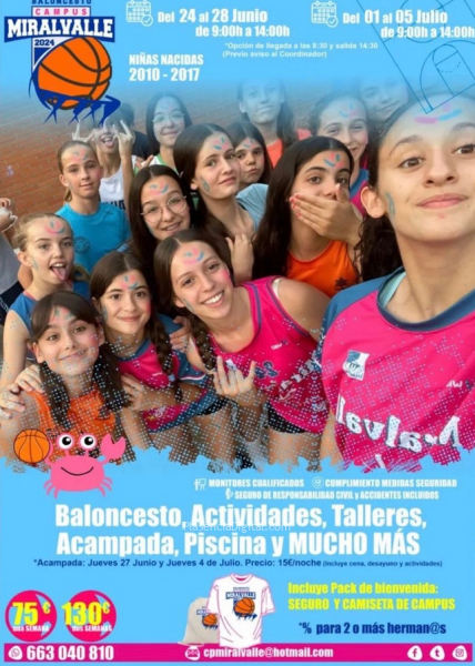 Este campamento está organizado por el C.P. Miralvalle y dirigido a niñas nacidas entre el 2010 y el 2017. Del 24 al 28 de junio y del 1 al 5 de julio, en horario de mañana. El campamento es de Baloncesto e incluye talleres, acampada, piscina y otras actividades.
