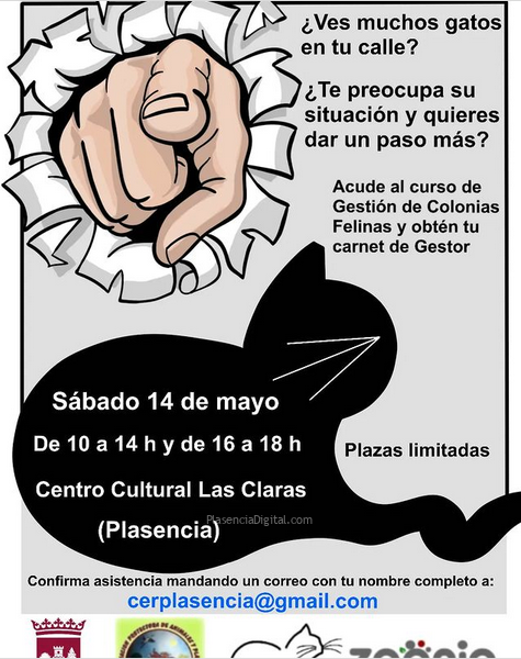 El sábado, 14 de mayo en el Centro Cultural Las Claras de Plasencia se desarrollará un curso de Gestión integral de colonias felinas. Más información e inscripción en: cerplasencia@gmail.com …