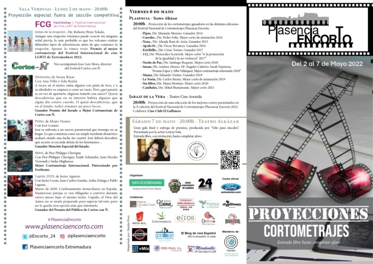 Del 2 al 6 de mayo se desarrolla la décima edición del Festival Plasencia EnCorto con la siguiente programación: Lunes, 2 de mayo:Sala Verdugo, 20:00 h.: «Cortos con Ñ» y …
