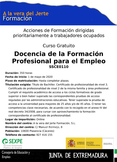 Abierto el plazo de inscripción del curso Online gratuito de Docencia de la formación profesional para el empleo dirigido prioritariamente a trabajadores ocupados. El curso comenzará el próximo día 1 …